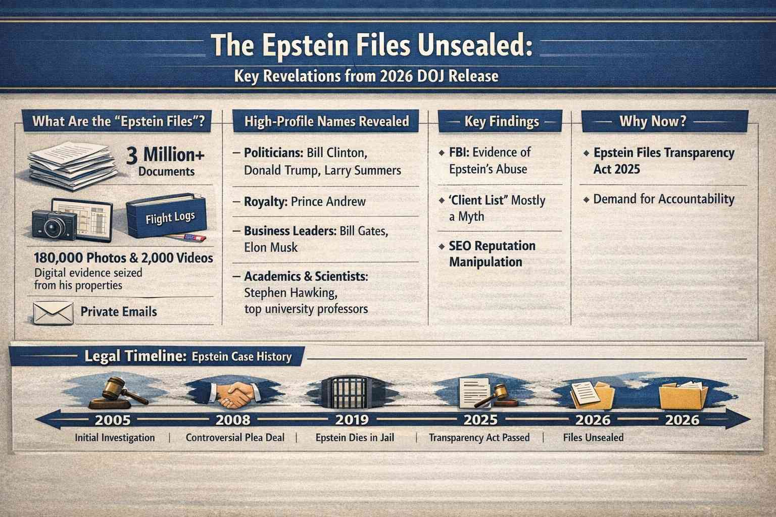 WThe epstein files explained: everything you need to know about the 2026 doj release the world is watching as millions of pages from the jeffrey epstein files are finally being made public. since the passage of the epstein files transparency act...